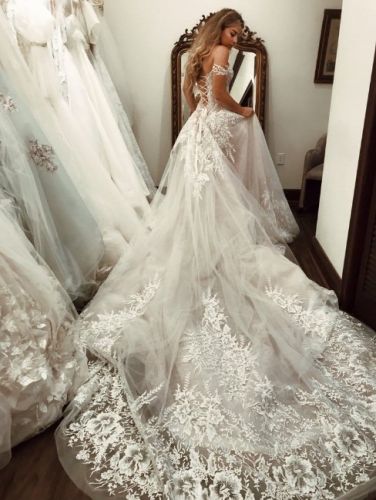 This is a romantic, couture-style bridal gown with a dramatic, ethereal presence. The overall look is soft, feminine, and luxurious, designed to emphasize elegance and movement.