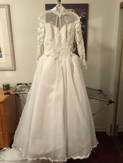 White wedding dress with pink rosebuds & lace on top. See-through material from breastline to top of neck. Long sleeves. Never been worn! Veil included.