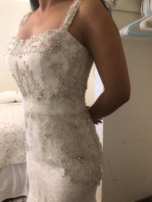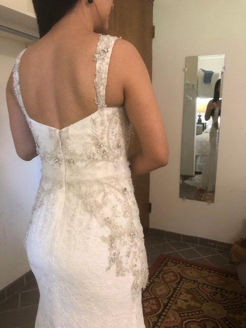 Elegant fit and flare cut, exquisite 100% silk with chantilly lace and delicate beading. Unique design. Romantic, feminine, and alluring. Clean, smoke free pet free home. This dress was never worn to a wedding, only tried on. It’s a $9000 dress! It pains me to sell for $1250, but I must sell it. My loss will be your treasure! Ivory color. Label size 6 Petite. Street size 2. (I am 5’1”, 118, and this is me with 4 inch heels)