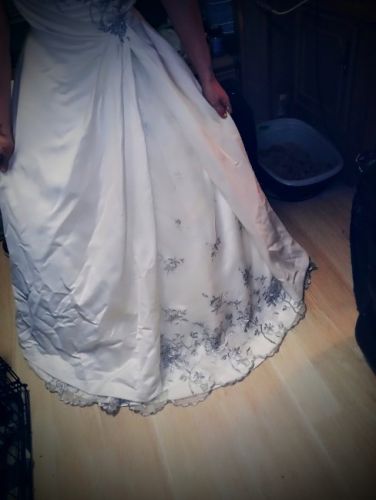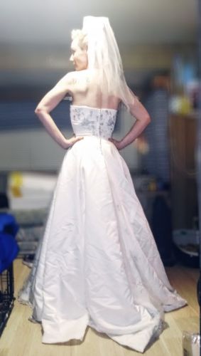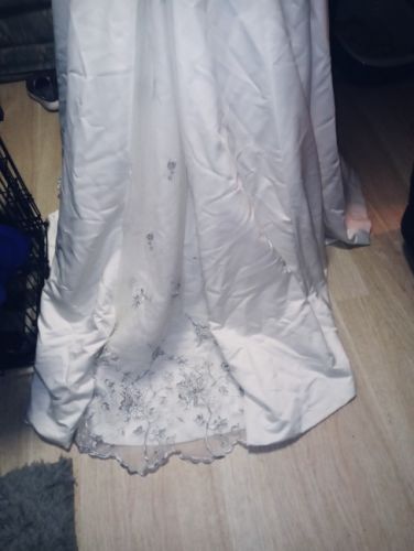 This beautiful dress is a Maggie Sottero size 2. It is to the floor with a slight train, A-line with a peakaboo skirt and it is strapless straight across. I also have the sparkling head piece and the Vail to go with it. It has been kept in its Bridal Chest.