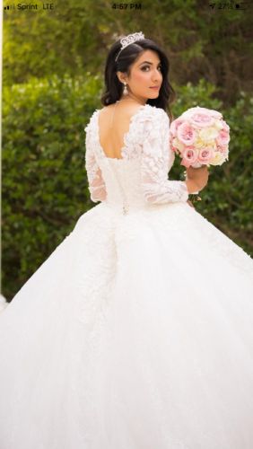 Embellished long sleeve dress in size 4(small). The back can be adjusted with the lace. Royalty dress with this absolutely breathtaking style, a look that's finely detailed from shoulder to hem with beads and lace.