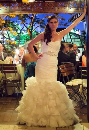 Gorgeous and striking Maggie Sottero Divina white strapless gown with lace-up back and mermaid silhouette. From the knees down, and throughout the dramatic train, the dress offers layers of flounce, and the waist is adorned with elegant rhinestones. The dress was worn once, and immediately dry-cleaned. (The dry-cleaning receipt is provided.) Condition is pristine; it's been stored in the dry-cleaner zip bag. Size 2. Bust:31"; Waist: 21.5; Hips: 35.5. 5'4" height, weight 117. Dress was worn with heels. Just over $1000 new.