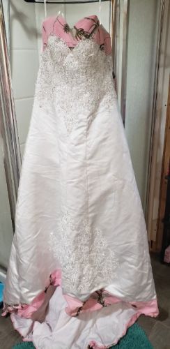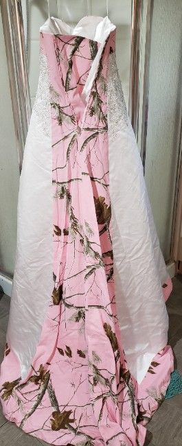 Size 4 pink camo and white wedding dress worn once for a couple hours. Tie back.