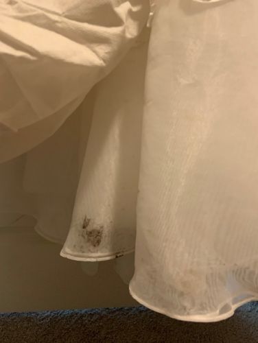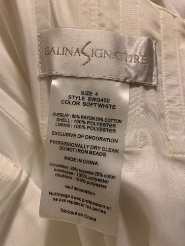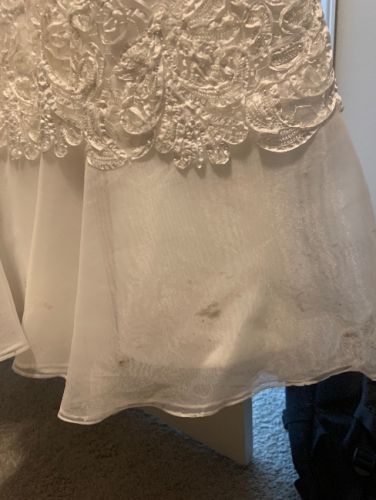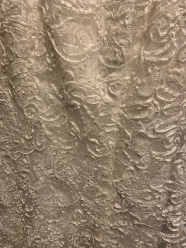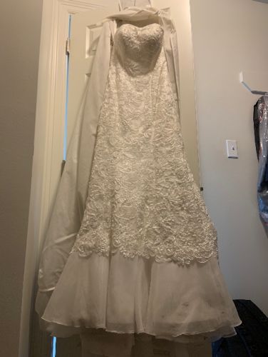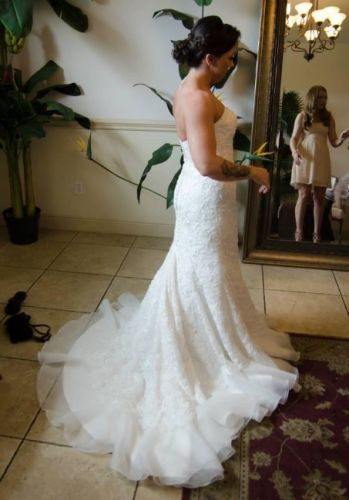 Galina Signature strapless dress, trumpet style with lace, flowers and scattered pearls. Sewn in cups currently, faux button up back. Skirt has a bit of a train with the tie up built in. Bottom will need to be cleaned.
