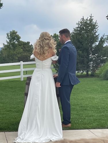 Beautiful light weight crepe wedding dress. Worn once and dry cleaned right away. In great condition.