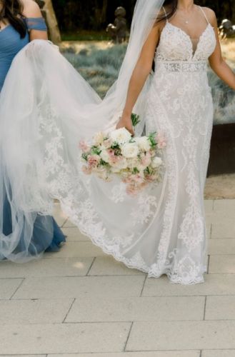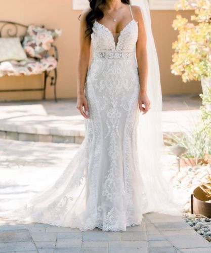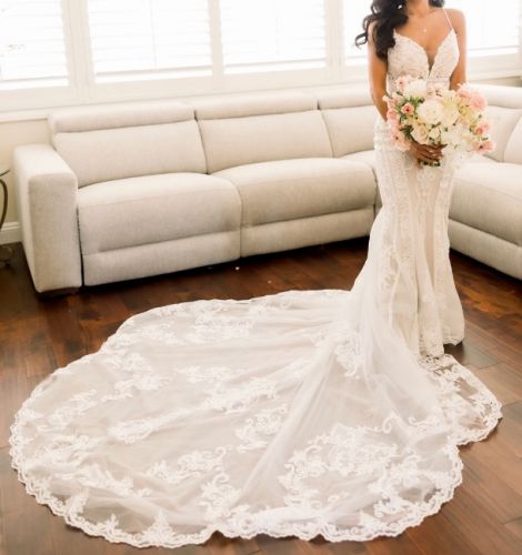 Beaded shoestring straps, widening into a strappy back detail over the shoulders. Graphic laces and linear details mix throughout the silhouette, sculpting the body for a universally flattering effect—complementing the sheer bodice covered in graphic laces and a wide, sheer lace waistband that is completely unique. The dramatic, sheer train flows out over the silhouette and forms a subtle scallop, with linear lace details applied throughout for an artful finish.
