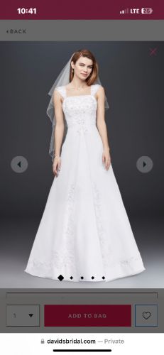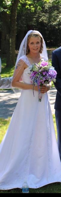 This dress may be simple but it’s stunning at the same time. I had been slightly altered and has a built in bra(cups) in the dress. The train is long and detailed. It also comes with the veil. The dress has only been worn once and it has been in the dress bag from David’s Bridal.