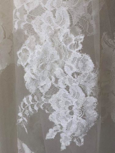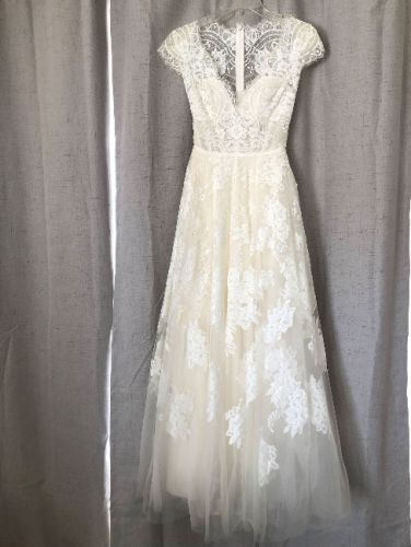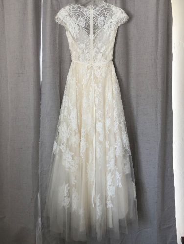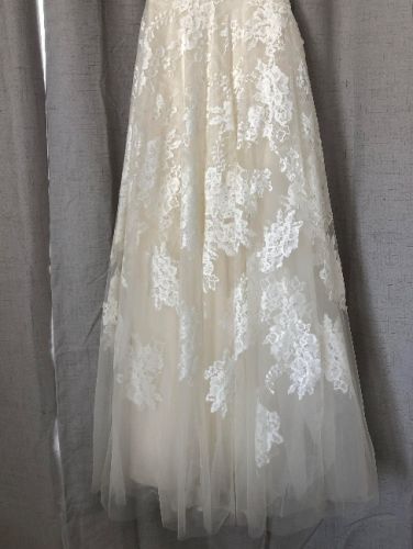 Elegant wedding dress in great condition. It has been altered for a petite person (shortened and sides brought in). Fabric from shortening can be included.