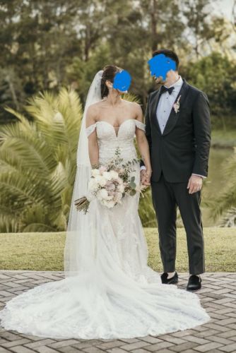 Classic sweetheart neckline and fit-and-flare silhouette. Encrusted with stunning beadwork and delicate 3D elements embedded throughout laser-cut chiffon, the laces are intentionally placed throughout the gown to create a unique and multidimensional look. A layer of glitter textured tulle adds another pop of dimension and shine, complementing the beadwork and crystal buttons at the back. Removable off-the-shoulder lace sleeves. Long veil is trimmed with a delicate border of pearls and crystals, outlining the circular style silhouette of the design.