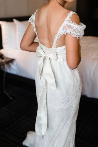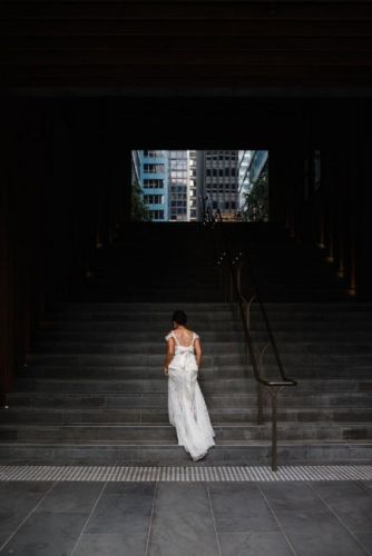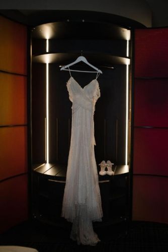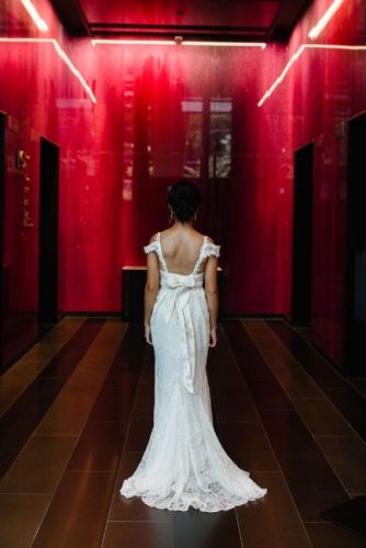 Beautiful designed dress by Anna Campbell. Very comfortable to wear and light. Size XS but the design allows you to tight at the back and self adjustable to a XXS or S. I love that I did not have to be on a strict diet as I can just adjust the waist and tightness of the dress on the day. I can also go to the bathroom by myself as the dress is light, easy to walk and dance in.