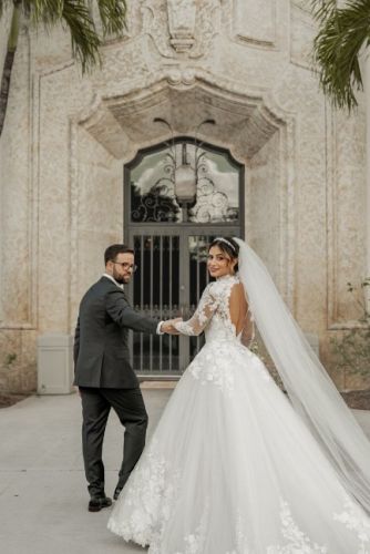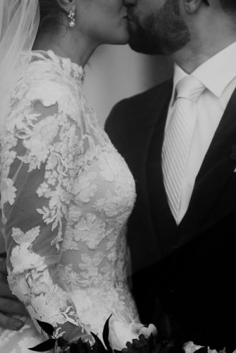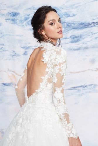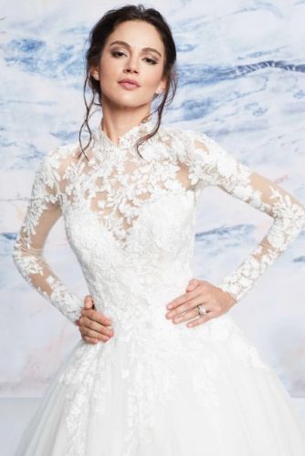 SIGNATURE BY JUSTIN ALEXANDER CAMBRIDGE For sale- Signature by Justin Alexander Cambridge is a regal tulle ball gown featuring floral lace details throughout! Sheer lace crafts the high neckline + long sleeves, + outlines the open keyhole back. A- Line style with a long train