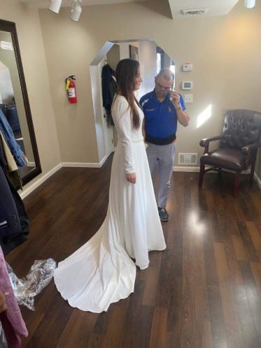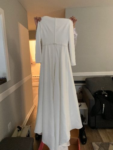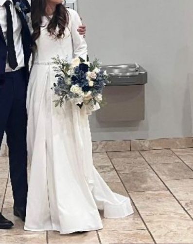I bought this dress for my special day. It was originally a size 8 but I have lost a lot of weight and ended being a size 4 with alternations. It’s a beautiful gown, simple and delicate.