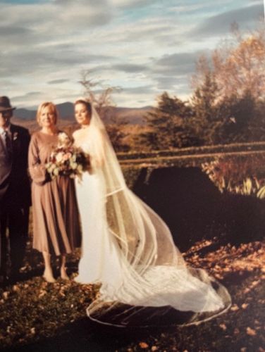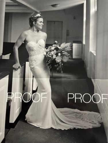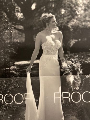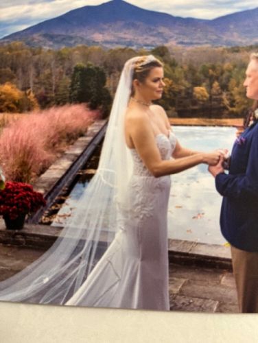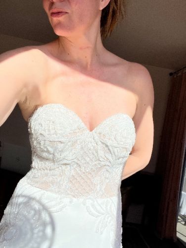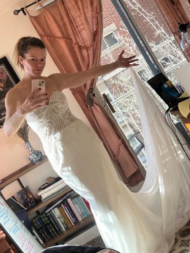 Hand beaded strapless corset top with sweetheart neckline fitted mermaid skirt with train that has a finger loop for hands free holding. I’m a size 4 and it fits me like a glove.