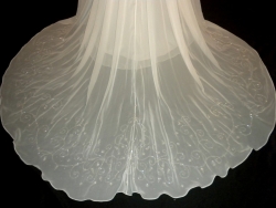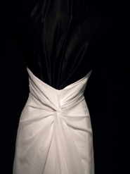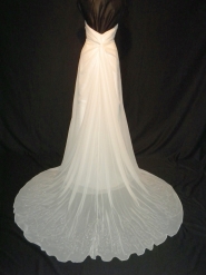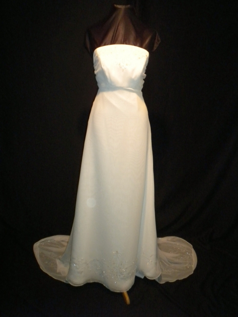 New with tags - pictures do not do justice to this Casablanca bridal gown (style #1622) ~ The gown is made from a white chiffon fabric. The strapless bodice is made with princess seams and it has soft ruching on each side. The back has a chic twist in the chiffon, accentuating the back and shoulders. The bodice is embellished with sparkling crystal beads that bring an incredible glow to the gown. The beading is mimicked on the lower portion of the skirt and train. The skirt hangs in sweeping folds of fabric and it has a delicate, dramatic cathedral-length train. The gown is fully lined and it closes with a side zipper and hook & eye closure. It is tagged as a size 6. (Im a size 2 in regular clothes) with the following measurements - bust: 34.5"/ waist: 26.5"/ hips: 37"/ length in front: 58"/length in back: 86". Fabric content: polyester.
