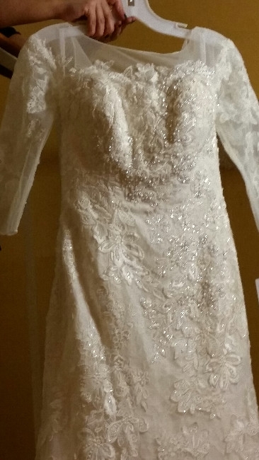 This beautiful lace trumpet gown has layered beaded lace appliques throughout the dress and an illusion neckline, chapel train. This dress was never used and has the tags on. Never been altered. Dress is packed in a garment bag. This dress is perfect for your romantic wedding.