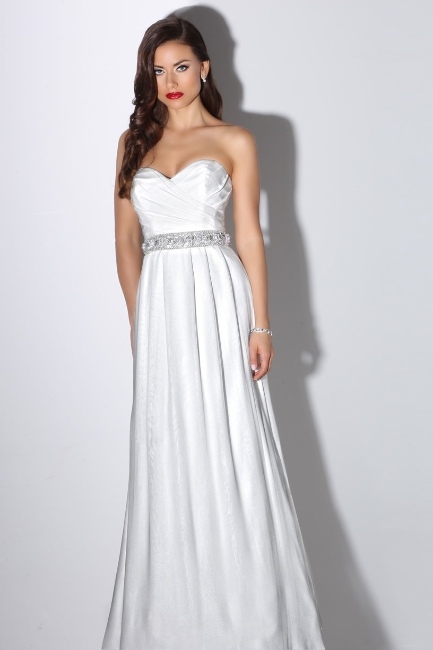 SILK CHIFFON, SWEETHEART NECKLINE WITH ASYMMETRICAL PLEATED BODICE, A-LINE SKIRT. BEADED BELT HIGHLIGHTS THE NATURAL WAISTLINE. FLOOR LENGTH, ZIPPER CLOSURE, CHAPEL LENGTH TRAIN.
