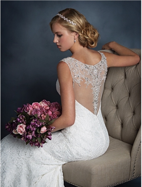 This beautiful Alfred Angelo Bridal Gown is a head to toe ivory lace fit and flare Gown with a champagne underlay. The back has an incredible illusion beaded back for a sexy and romantic look. ***It has never been worn or altered!!! **** This is the perfect dress for any wedding location!!