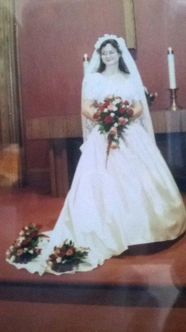 The bodice is lace over satin, beaded and sequined. The skirt is satin and requires a hoop. There is a short train with loops to enable it to be pulled up and attached to buttons under the back bow. Zip closure.