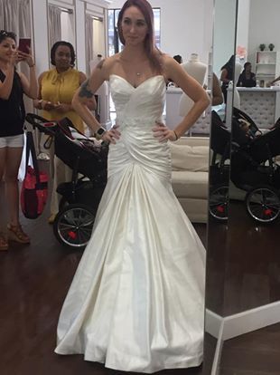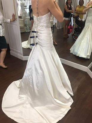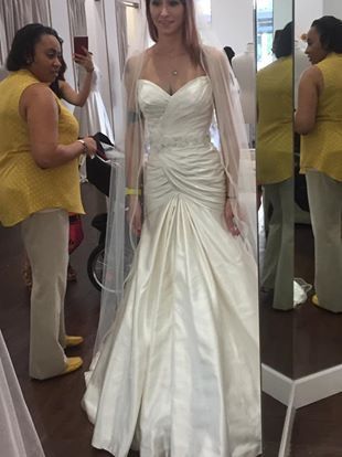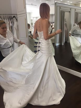 Modified sweetheart neckline. Satin. Rouched bodice and chapel length train. Embroidered and embellished belting at natural waist. Low back. Has matching bolero jacket. Still new with tags, unaltered in any way. Never worn except to purchase. New 1800, asking 700 or best offer.