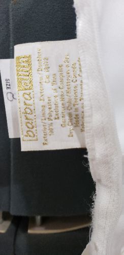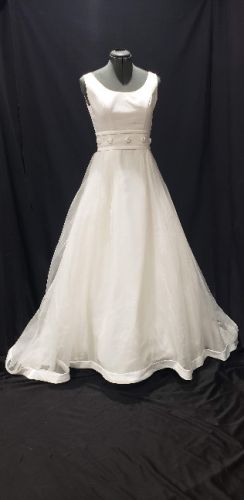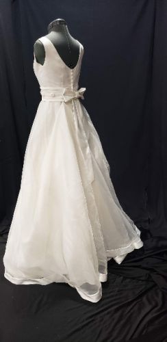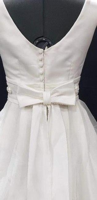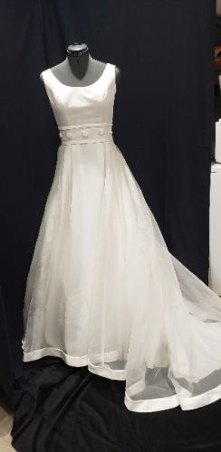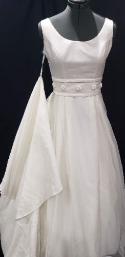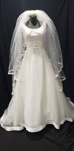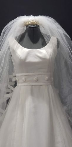 Dress has a sewn in petticoat, Zippered back hidden by buttons to appear that it is buttoned up. The top is a halter top style that flares right under the bust to form the typical A-Line style dress, a perfect dress for a Spring or Summer wedding. The dress is simple but looks formal and elegant with fancy jewelry and the tiara compliments the look.