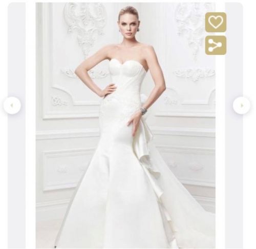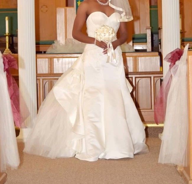 Only worn for wedding and reception. needs cleaning. The tulle is a little ripped from being stepped on but can be easily fixed. Wedding Veil included.