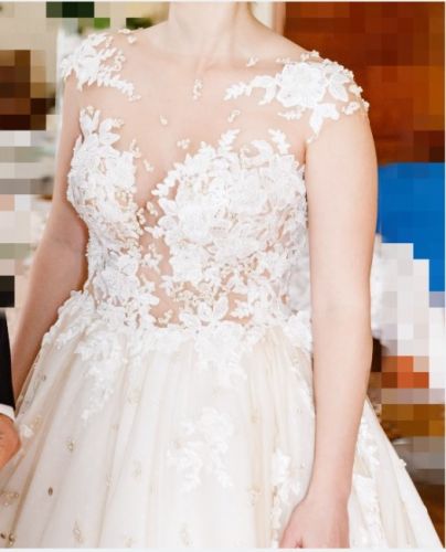 This dress will take your breath away with its design, execution and materials. The magnificent design of the dress is done by Milla Nova, it incorporates illusion with beautiful flowers and pearls throughout the dress it also has a bustle up,