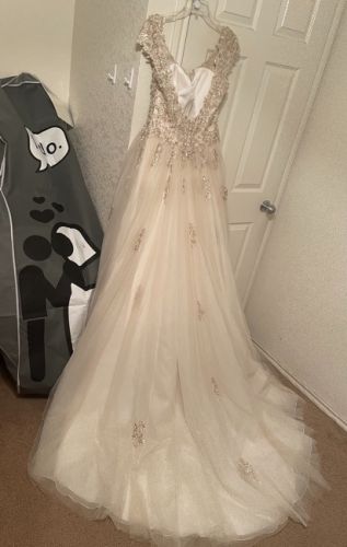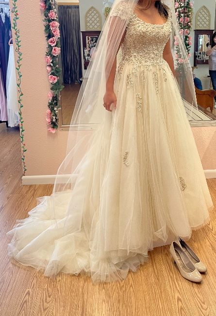 Brand new! I loved this dress at the boutique and I felt like a princess! Gorgeous A-line tulle! My wedding is still more than a year away so I have not worn this at all other than at the boutique. Although it is stunning, I found a simpler dress that I'm even more in love with. I would like to sell this to get my dream dress.