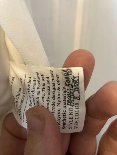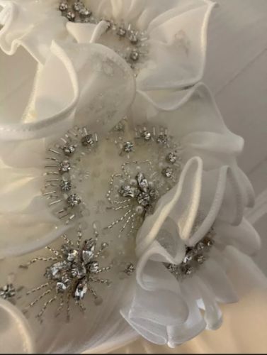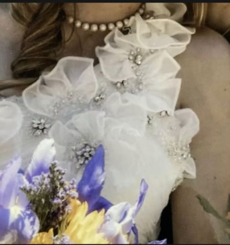 ( placement of buttons shown in second to last pic, indicated by red circle) with corresponding hidden loops on the train to pull it up for ease of walking. Comes with matching shawl. Dry cleaned before storage. Comes from a smoke free home.