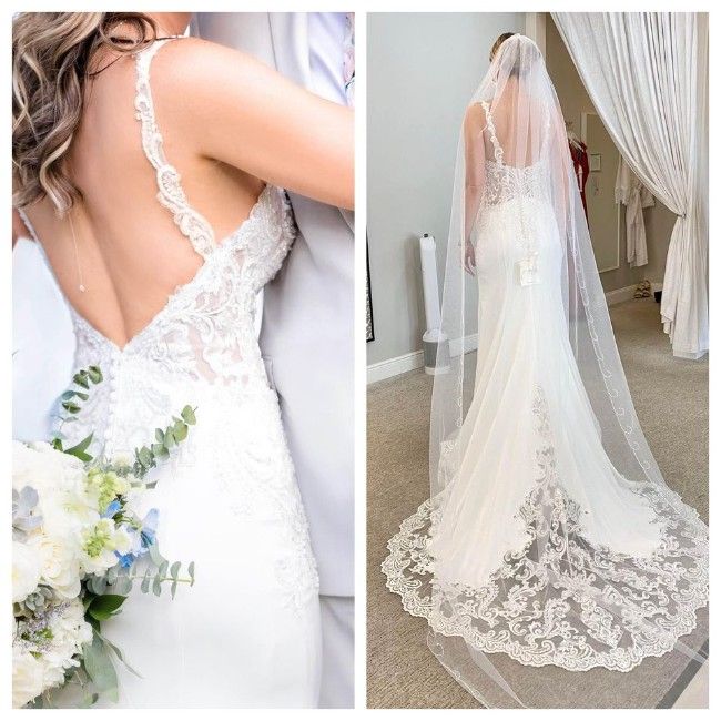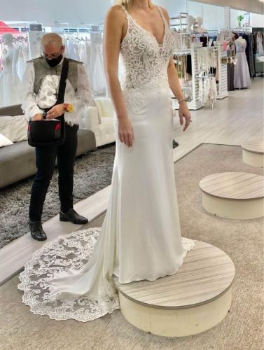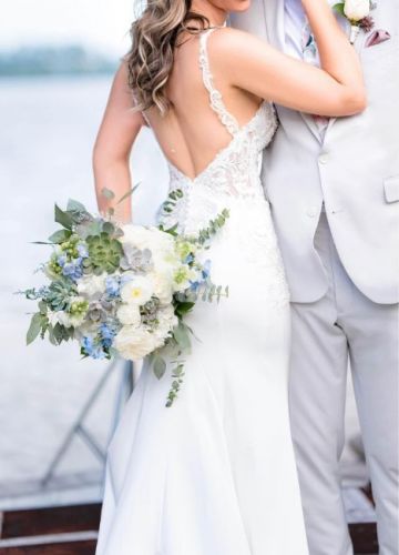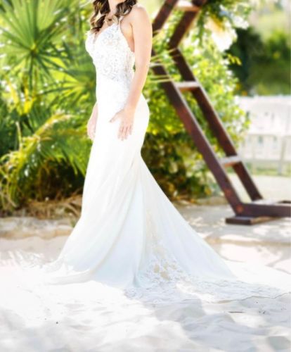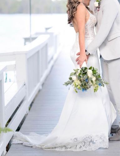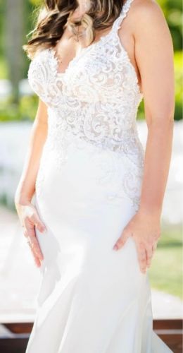 Beautiful Wedding Dress with a stretch-like fabric great for dancing! The back was altered into a V shape (see wedding photos).