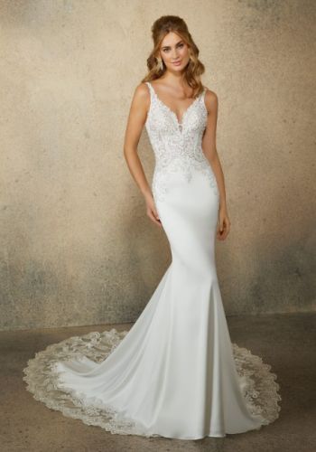 Features pearl and crystal beaded embroidery on a slim, stretch satin gown, long Scalloped Train. The v-neckline complements the sheath silhouette.