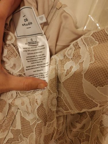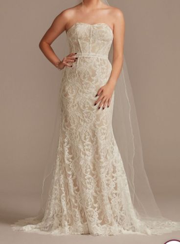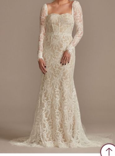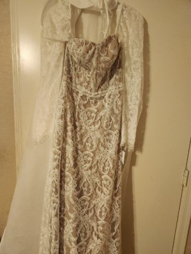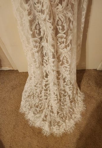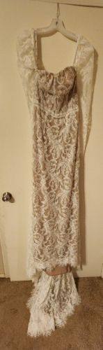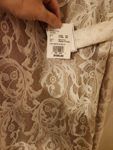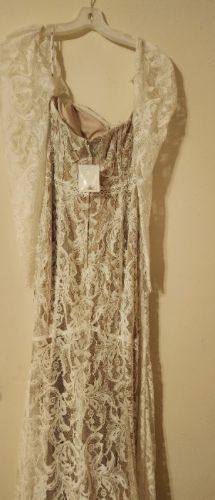 NWT only tried on twice. Has removable sleeves, shealth style with lace. Beautiful dress, just went with a different look for the wedding. When I purchased this dress I was a size 2/4 in jeans. Preferred meduim to large shirts and was a 34 B.