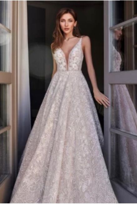 Stunning dress. Raised floral detail. Low V neck, but inbetween sheer lining so there is no worry about movement. Cups built in. Website and website desp listed below.