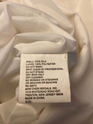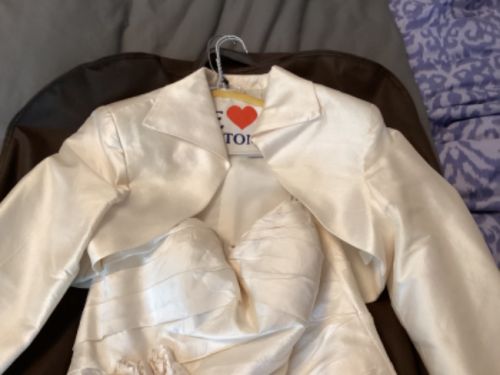 Silk Wedding Dress, this dress has been worn but I think someone else can definitely wear it again. I like this dress because it had a matching jacket. There are some faint stains around the bottom of the dress, the last pic is a stain on the lining close to the bottom of the dress. All of these stains will not be visible when wearing. I had the dress cleaned after I worn it but it would need a good steaming. The dress is a size 8 but it was taken it to fit me. At the time I worn it my measurements were B 34”, W 28”. My height is 5’ 3”. The dress measurements are: B 35”, W 30 1/2”.