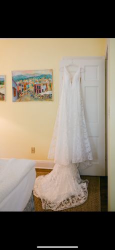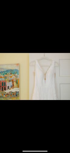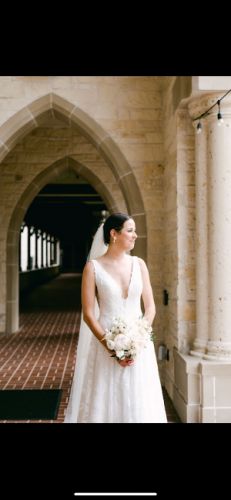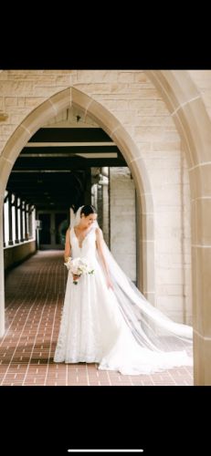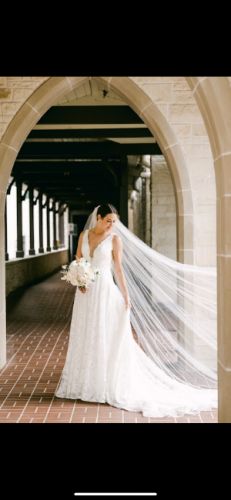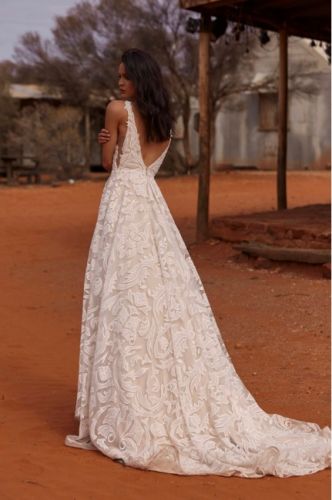 Aline silhouette in ivory & white. Exclusive lace designed in-house featuring laser cut embroidered chiffon. Plunging V neckline softened by lace appliqué overlay. Sheer tulle insets provide support across the bodice and offer sensual sheerness dipping into a V under the arm. The same V is mirrored in the back. Medium length train with bustle buttons.