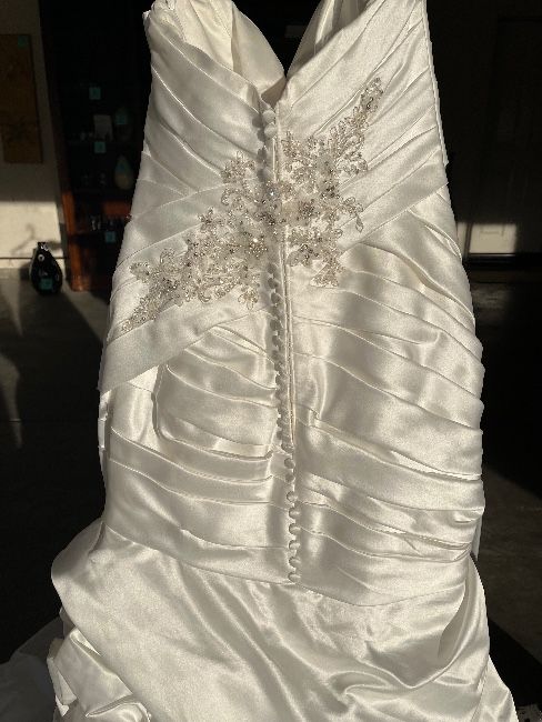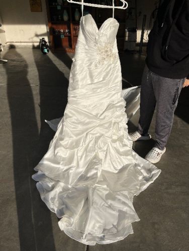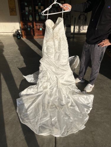 Sweetheart neckline with a mermaid silhouette bodice. Buttons down the back and appliqués on the front and back. Train is approx. 4ft. long and can be tied up when done. Mild alterations were done at the time and additional adjustments would be ok. Need to sell due to relocation!