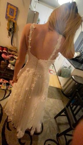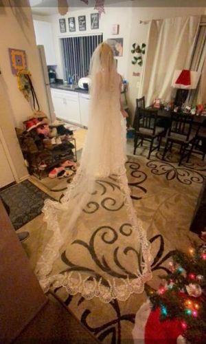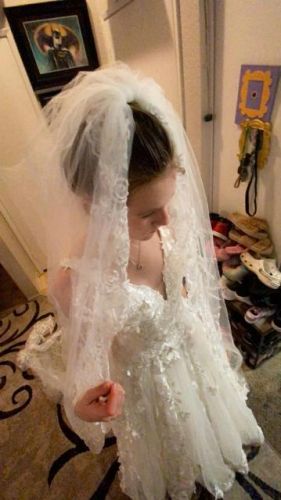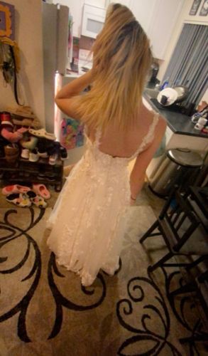I don't know the correct wording to describe wedding dresses but I can say this wedding dress is absolutely stunning. I work for a 2nd hand store and this dress was donated by a dry cleaners, no one came to pick it up in time. I saw it when it came in, it sat for a good week and since it didn't sell, I bought it because I would hate for this dress to just sit on a rack in a thrift store when it can be making a special woman feel like a princess on her wedding day. It is a ball gown style, with what appears to me as hand sewn embroidery and pearls. The fabric used is sturdy expensive fabric and lace, this dress is not going to be falling apart any time soon, that's for sure. It has a zipper to sip up the back, sewn-in cups and breast support. Veil is included also. It it has a long train and the same embroidery as the dress. If you have specific questions about it or want to come take a look at it, im fully available so just text/call me (657) 615-8202. Im asking $1000 or best offer. I have cash app and Venmo.