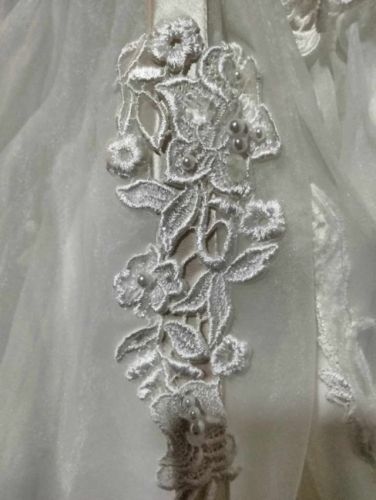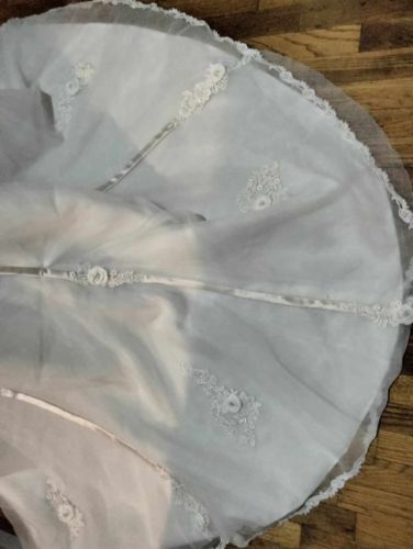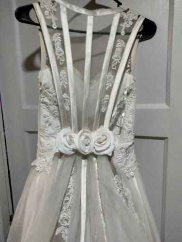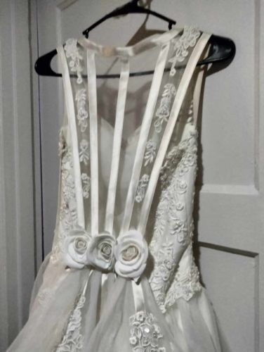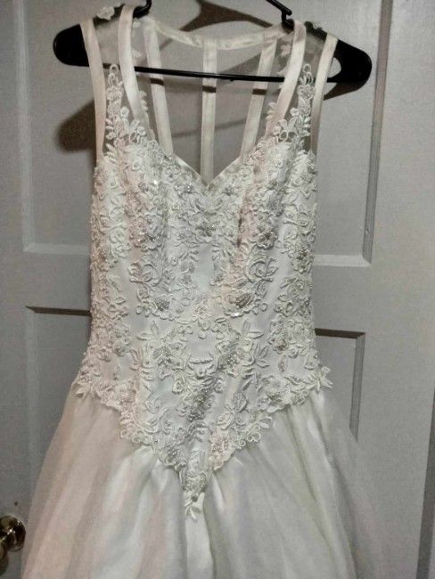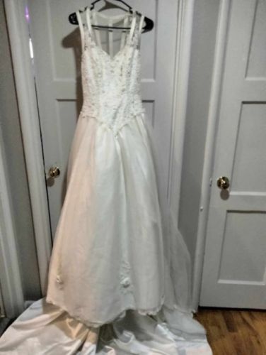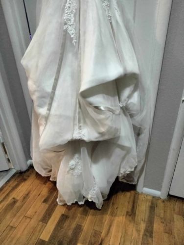 Beautiful Justin Alexander sweetheart gown size 6 illusion back. Very long train. Has beautiful beading and detail. Has a wine stain towards the bottom that can be cleaned. Besides that which you can't see when the dress is on. The dress is stunning. Also can be tied up so the train doesn't drag after the wedding. Comes with the Vail and beaded clip that hold the Vail in your hair. Measurements are 13" waist when laying flat, 52" from top front to bottom front 87" from top back to end of the train 13" from top to waist dress originally cost $3500