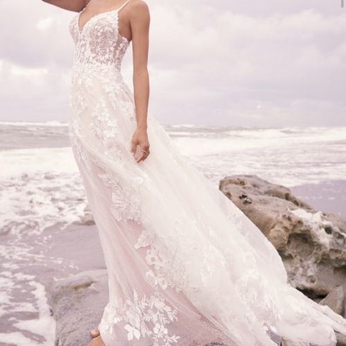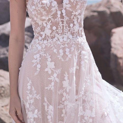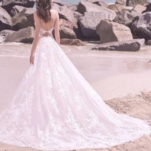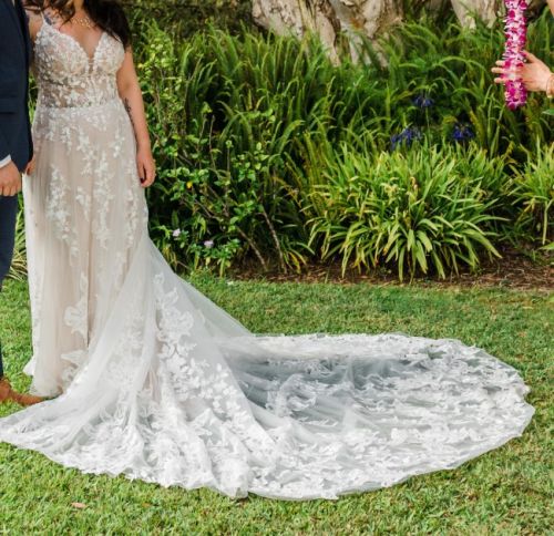Stunning Ivory over Blush with Ivory Illusion- lace dress with a semi sheer mid drift and a keyhole back beautifully long train that can be hooked up on the sewn in spots- for easy walking/dancing. A Line Silhouette, Extra fabric comes with it - if you desire to have it taken out or in a few sizes. At the time this dress was worn it was measured for someone who was about 5'4 with heels (145lbs) bust 34C waist 29'.
