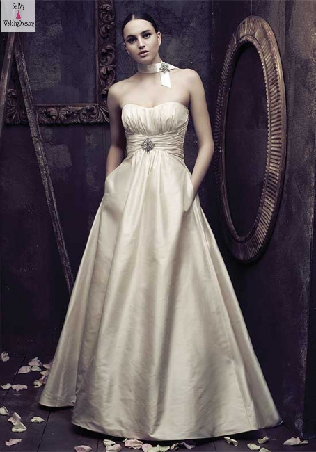 This dress is an original. The base dress is a Paloma Blanca gown, made of dupioni silk with a sweep train. It has added detailing (as pictured), ties for the train, and pockets. You won't find another dress like it. A matching, extra long veil with satin trim and flower hair piece are included.