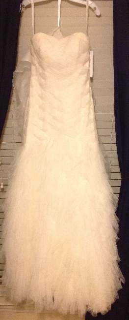 This is a designer mermaid style wedding dress by Galina Signature. It has never been worn except when tried on, tags still attached. No alterations have been made. The fabric is tulle, color ivory, strapless gown. It's a gorgeous gown with a beautiful basket weave design. Very flattering, fun and elegant. Included with the purchase are: garment cover, ivory rhinestone sash, and mermaid petit coat. Sash and petite coat are brand new, tags still attached. Everything is pretty much brand new.
