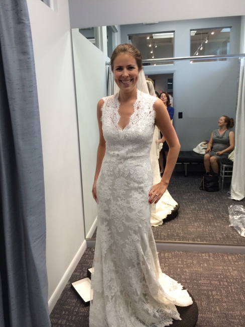 This beautiful lace sheath dress has never been worn or altered! It fits beautifully and has a champagne underlayer and a keyhole back. It is a size 8 on the tag, but similar to a size 4 street size. It has been cleaned and preserved and it is perfect condition - same as when I bought it.