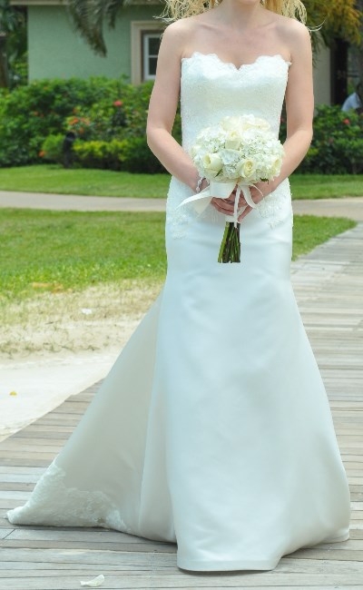 Augusta Jones - Lucille - is a stunning wedding gown from Castle Couture. A sweetheart strapless neckline, a striking silhouette, fit & flare. Label size 6. Street size 2-4. Satin & Lace, covered buttons on the back, lace trimmed bodice with lovely detailing on the train - a gorgeous back! Professionally cleaned and preserved in a bag.