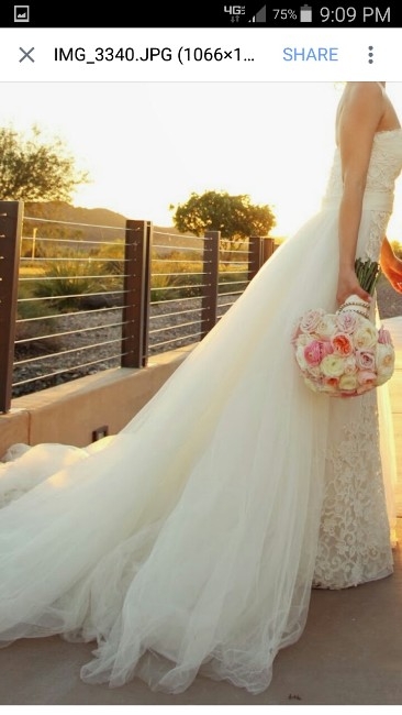 Original owner selling dress in stunning condition. I wore the dress in 2013 for my wedding; it is in perfect condition after being dry cleaned and stored in its original packaging The label size is 8 and I had it altered to fit a street size of 4 - 6. The Bust is 31, waist 28, and length 5.5'. The olor is Light Ivory. If you have any questions, please ask.