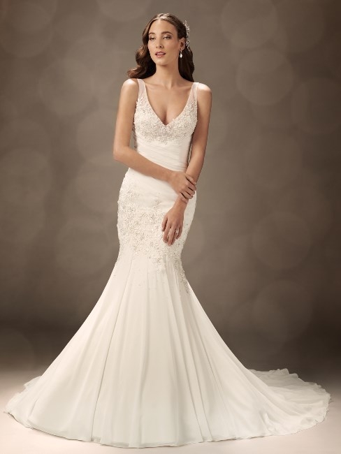 Sophia Tolli's Arena is a gossamer chiffon and lace wedding dress with plunging V-neckline framed with lace appliqués, A-line silhouette features draping through the waist, asymmetrically placed lace appliqués and soft gathers in the skirt, zipper back closure with covered buttons. It fits beautifully through the hips and tush (I was worried, but it looked amazing when I tried on the bridal store dress!). Never been worn, tried on, or altered. Size 8. The applique has little ivory "pearls" and "diamonds" on it.