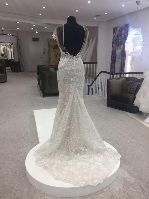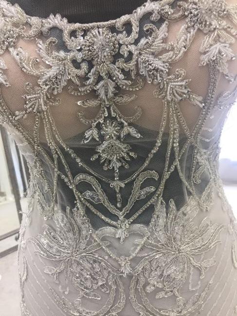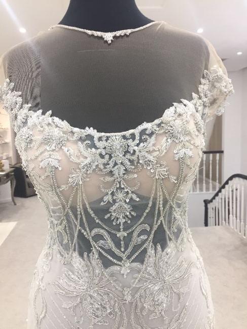 SPARKLING OFF SHOULDER WEDDING DRESS WITH CAP SLEEVES AND SHEER ILLUSION.