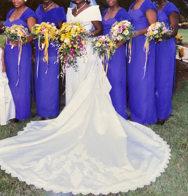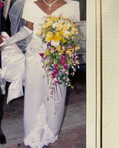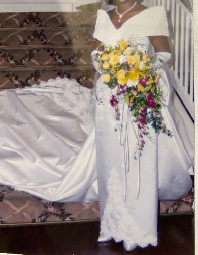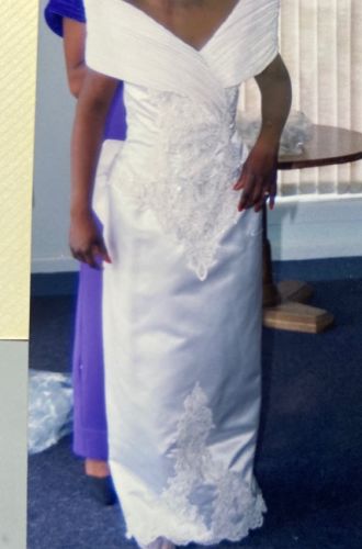This classic, off the shoulder, white, mermaid style wedding dress was worn once and is being sold with its detachable train. It is in pristine condition, not stained, torn or yellowing. It was dry cleaned, pressed and boxed within days after the wedding. It is a size 10, but was altered in the waistline and length to fit my 5’4” frame. This beautiful dress has sequins, lace and beading in the bodice, at the ankle and on the train. Please feel free to call for additional details.