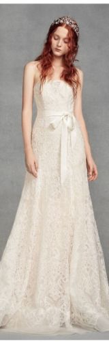 Brand new, never worn. 2 were bought and this one was not worn. Macrame trumpet style with ivory lace and champagne lining. Zipper back with boning in corset, intricately embroidered, allover macrame lace over organza. An illusion-inset bodice with a corset-detailed back provides delicate detail.