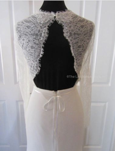 Chic chiffon and lace sheath wedding dress featuring delicate chantilly lace long sleeves and bodice with a beaded jewel accent on a thin satin ribbon.