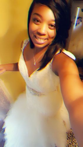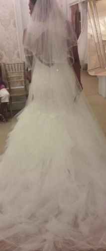 Cap sleeve, sweetheart neckline, buttons down the back. Includes Veil!