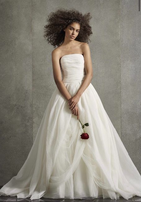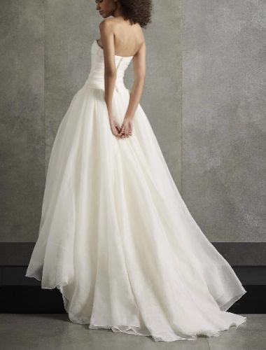 This magnificent textured organza wedding dress from White by Vera Wang features a flattering draped bodice and an asymmetrical skirt with a split-front overlay. A modern dress for a dream day.